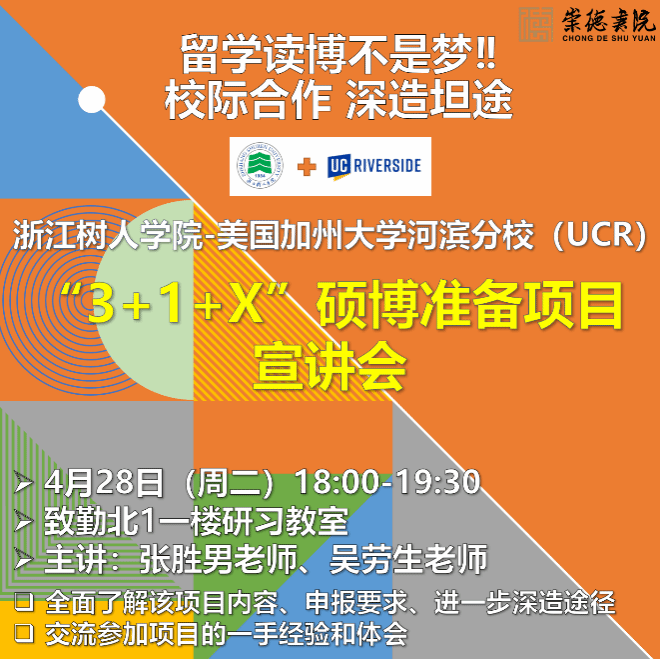 “3+1+X”硕博准备项目选拔我校在读大三本科生(五年制专业大四,以下相关信息以此类堆,不再重复),第四学年前往UCR学习,根据自己的专业进入不同的学科方向。参与本项目学生在UCR注册为“UCR硕博准备项目”非学位学生,在第四年就读期间,修读三个学期12门课程,共36学分。学生在美期间的学分参照我校《浙江树人学院国际交换生管理办法》文件予以认定。顺利完成第四学年学业、满足我校毕业要求的学生即可获得浙江树人学院毕业证书、学位证书和UCR高级结业证书。满足UCR研究生申请条件的学生可直接进入UCR硕博阶段的学习,或者申请美国、世界范围的其他高校。